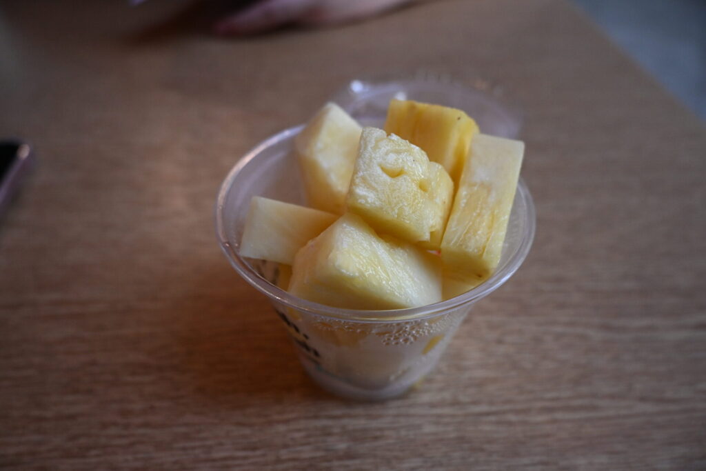 近くにあったこの店に。生パイナップルを3SGDで購入(当時373円)。日本のパイナップル同様の味で普通に美味い。