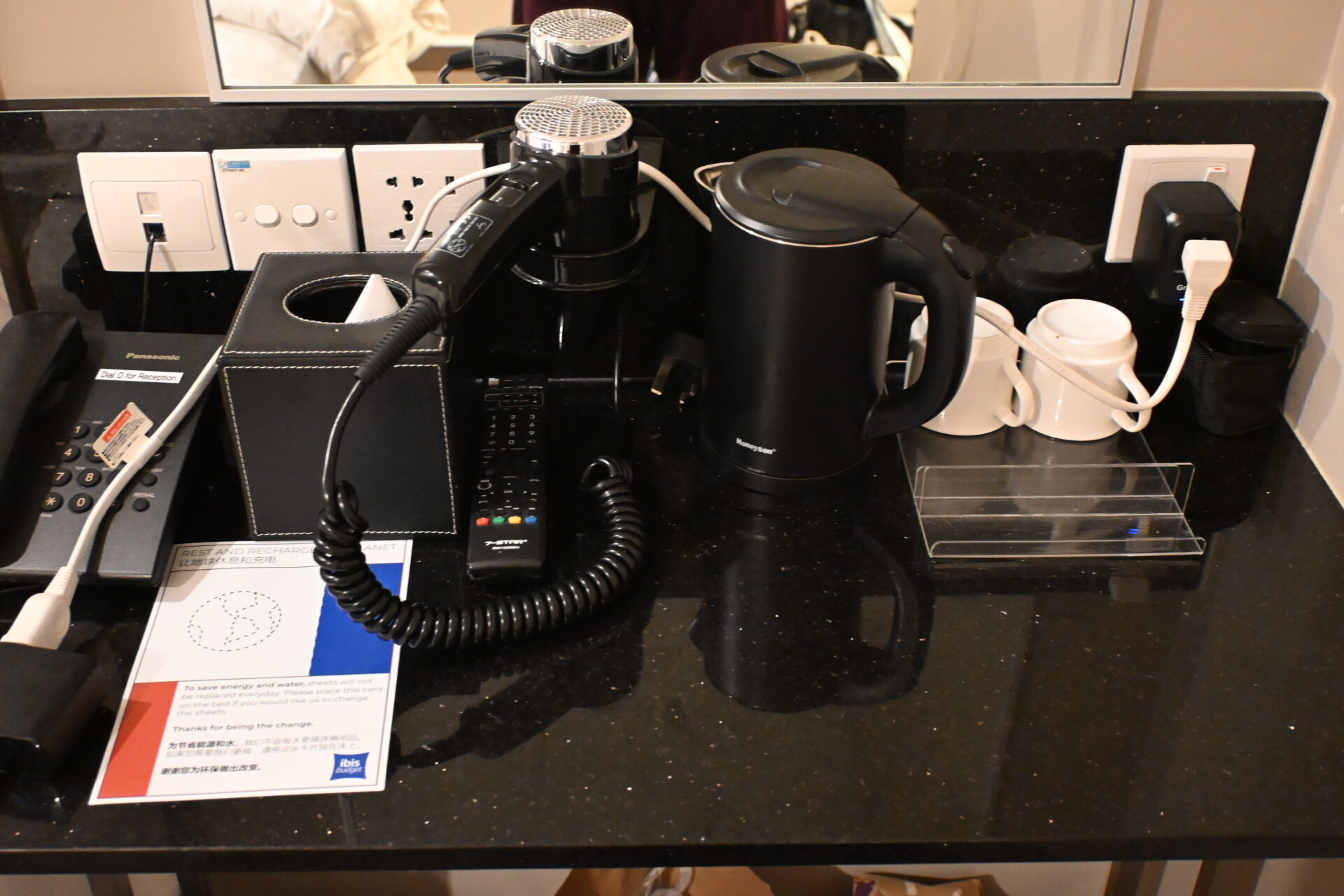 ルーム内の設備としては、ドライヤー、ポット、カップ、ティッシュ、バスタオルくらい。歯ブラシは置いていないので、自分で用意する必要がある。