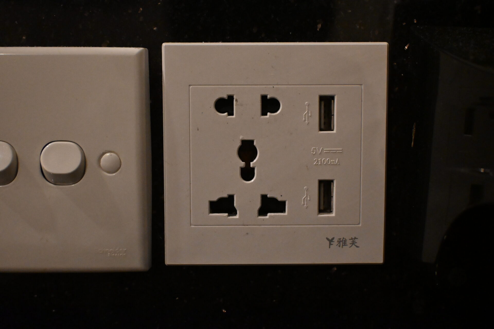 コンセントはこんな感じ。日本のものと形状が違うので、変換プラグは必須。あとはType-Aの差し込み口もあった。